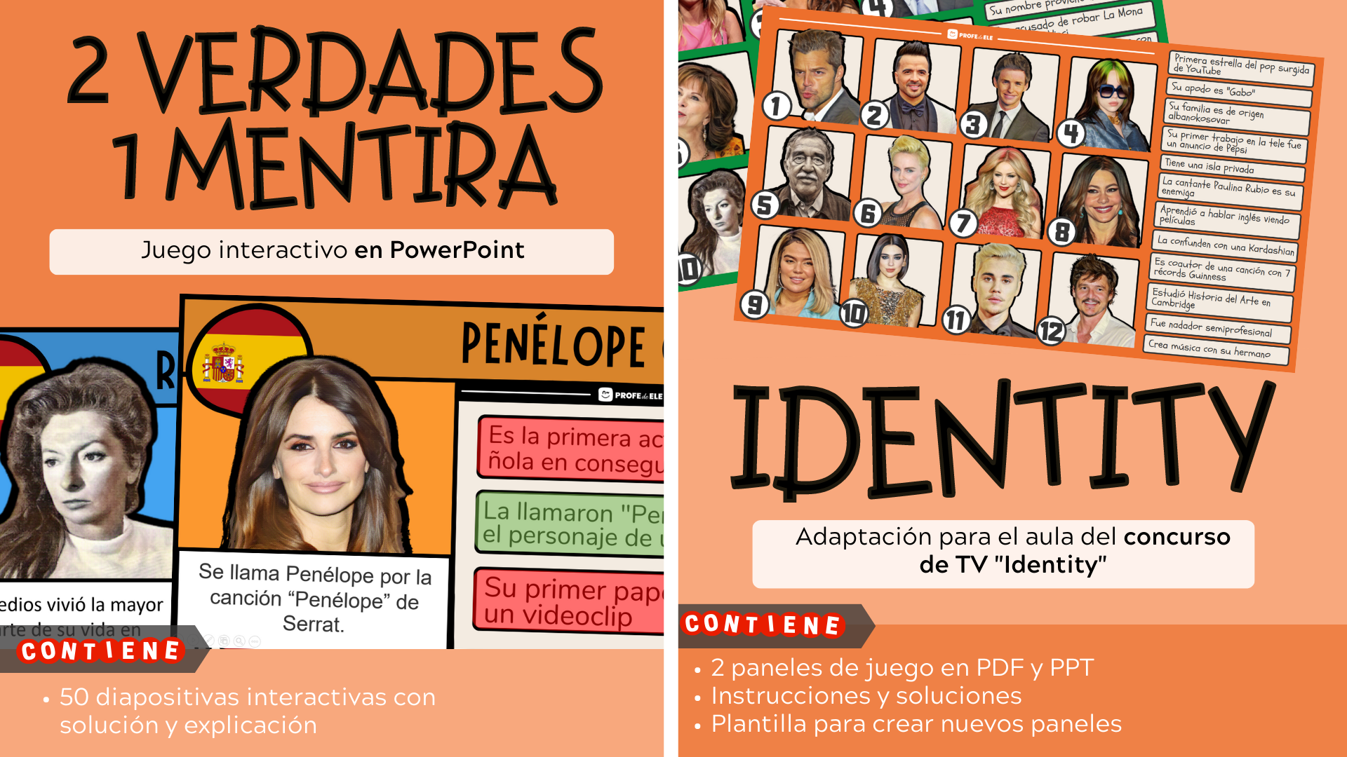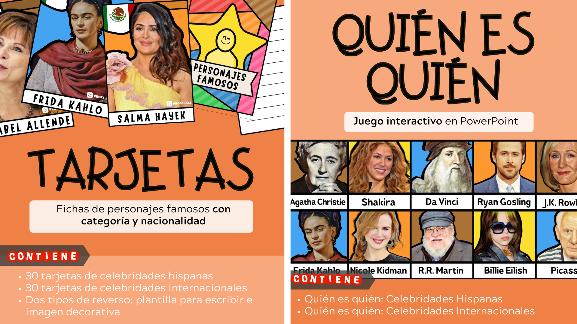 Descarga Nº18 ¿Qué encontrarás en esta descarga? ⭐ 30 tarjetas de celebridades hispanas + 30 tarjetas de celebridades internacionales. ⭐ 2 juegos "Quién es quién" interactivos en PPT. ⭐ 50 diapositivas interactivas de "2 verdades 1 mentira" ⭐ Plantilla para escribir sobre un personaje famoso ⭐ Ficha para completar y jugar a "Adivina el personaje" ⭐ Fichas de famosos, objetos y personajes