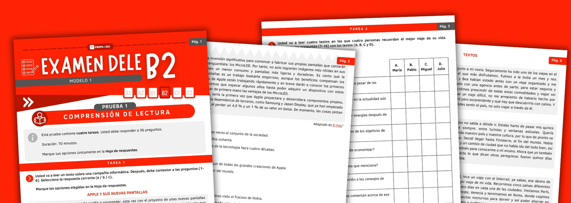 Un modelo de examen DELE B1 completo (el mismo disponible en la versión web) creado por ProfedeELE con las cuatro pruebas: