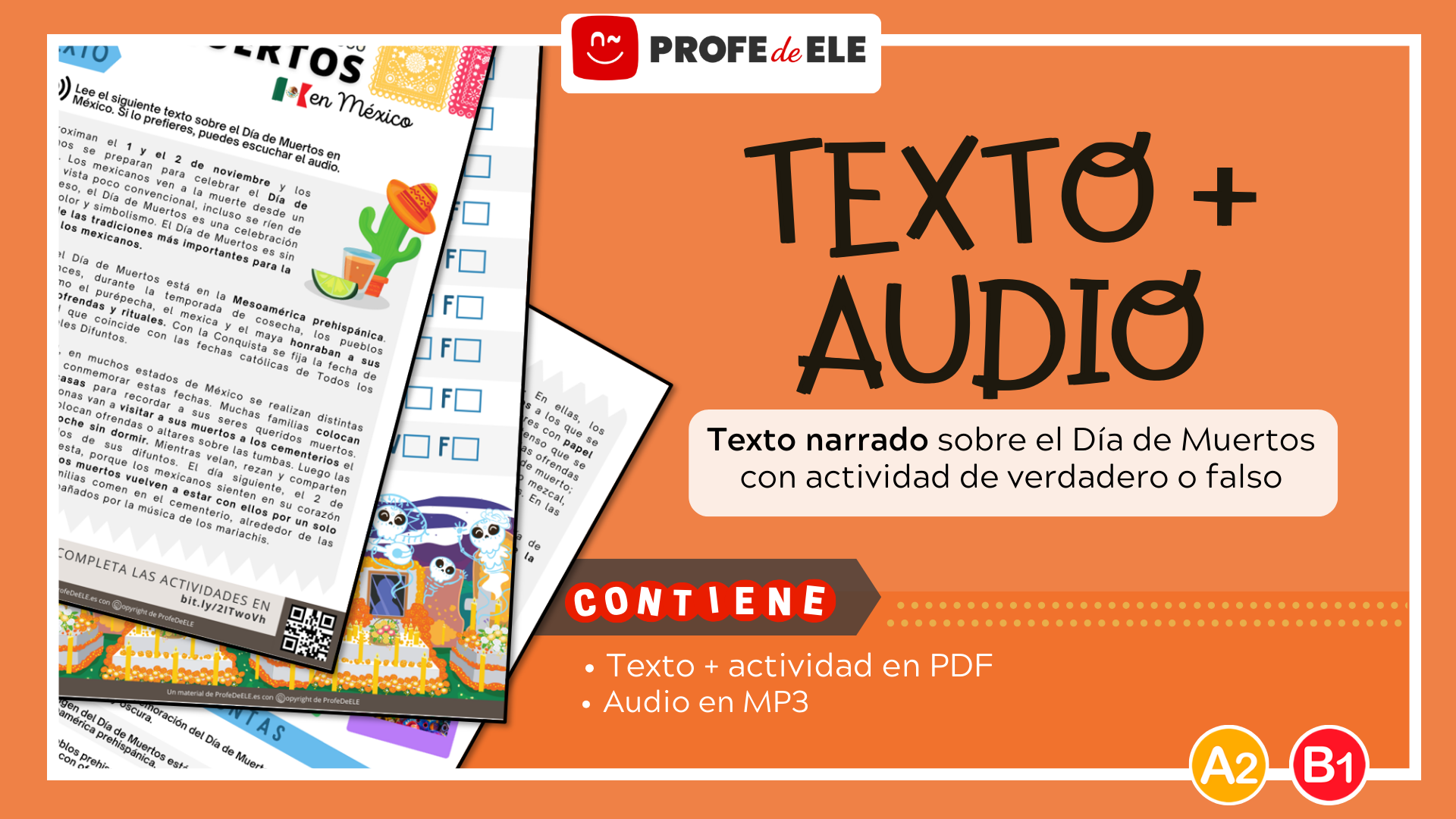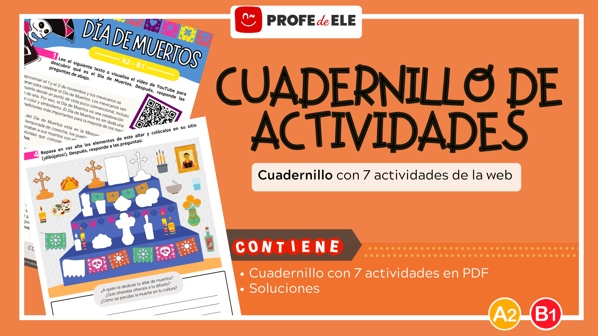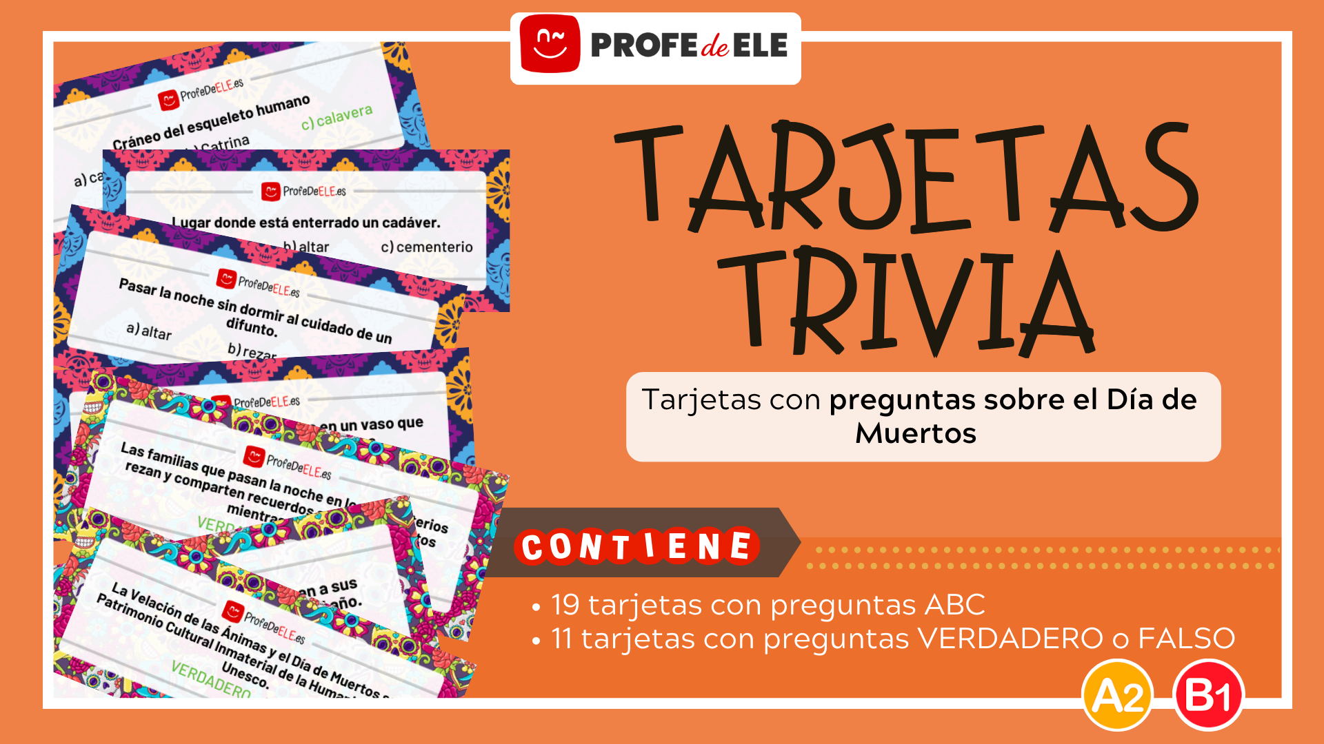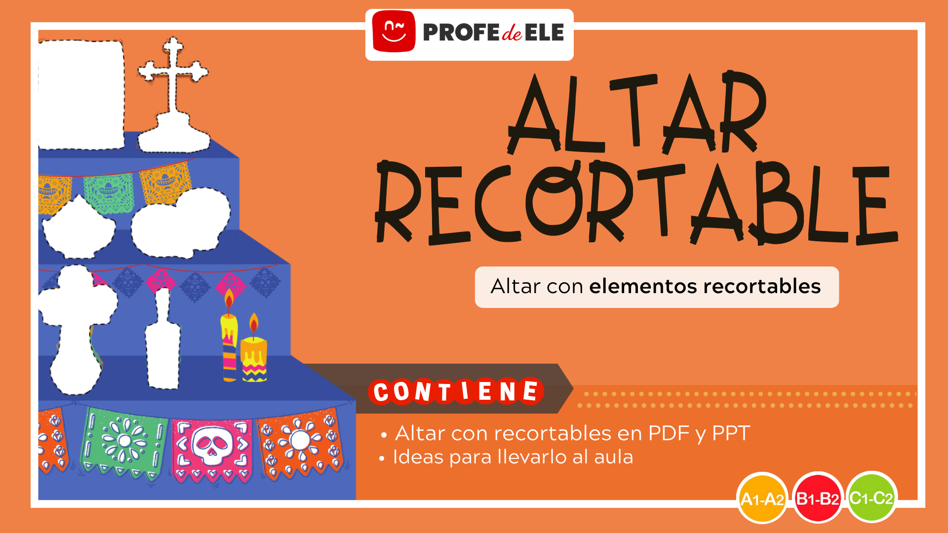 Descarga Nº21 ¿Qué encontrarás en esta descarga? ⭐ Texto + audio con preguntas sobre el Día de Muertos. ⭐ Altar recortable con ideas para llevarlo al aula. ⭐ 30 tarjetas con preguntas tipo trivial. ⭐ Cuadernillo de actividades con 7 actividades de la web.