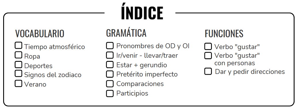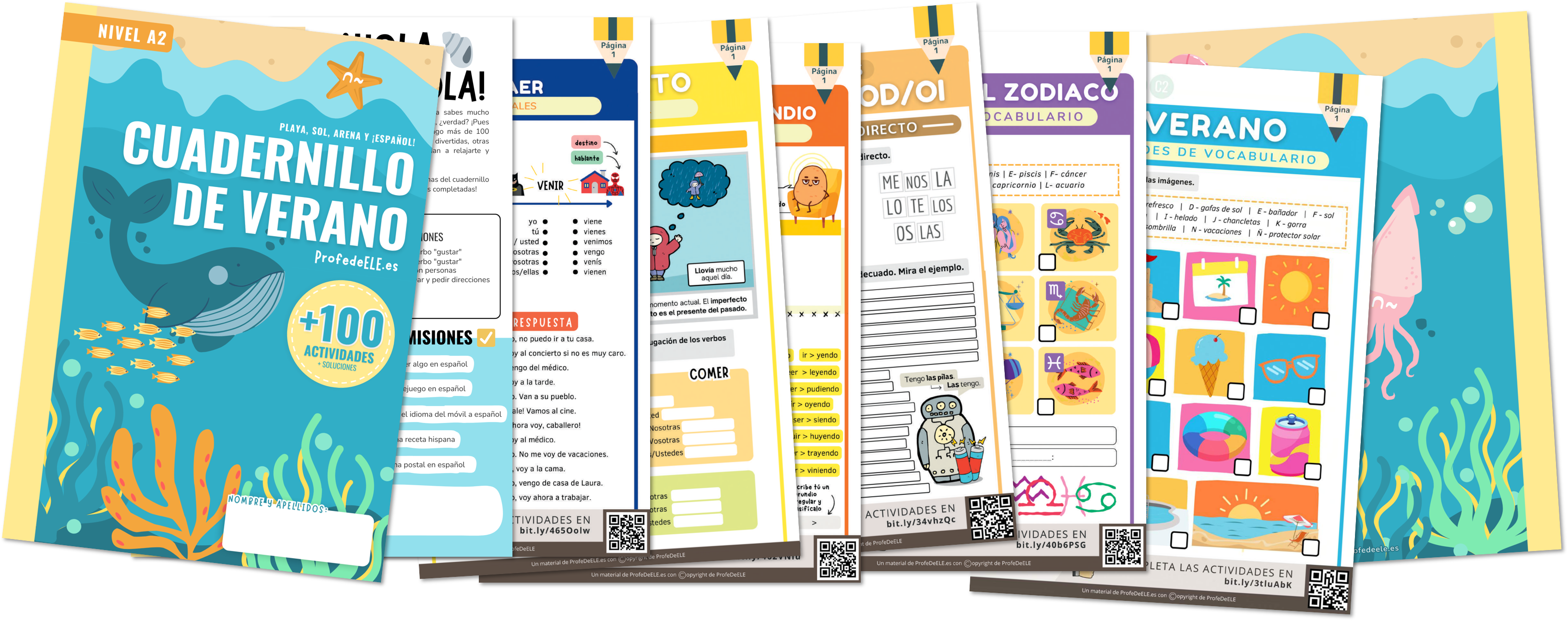 Esta descarga incluye 14 cuadernillos de actividades (cada uno valorado en 6€) de nivel A1 en dos formatos: Unidos en un cuadernillo de verano (con portada, contraportada, índice, misiones y página de notas) Por separado